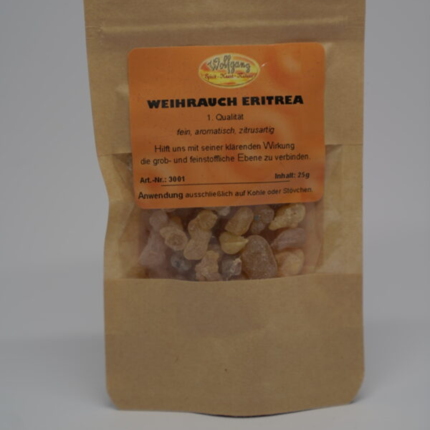 Eritrea First Choice Weihrauch (Boswellia papyrifera) – 25 g reines, handverlesenes Premium-Harz aus Eritrea. In 1. Qualität („First Choice“) und wild geerntet. Der Duft ist warm, balsamisch und leicht zitronig – optimal zur Verbindung von grob- und feinstofflicher Ebene. Ideal für Meditation, Raumreinigung und spirituelle Rituale. Praktisch: im wiederverschließbaren Kraftpapier-Beutel verpackt.
